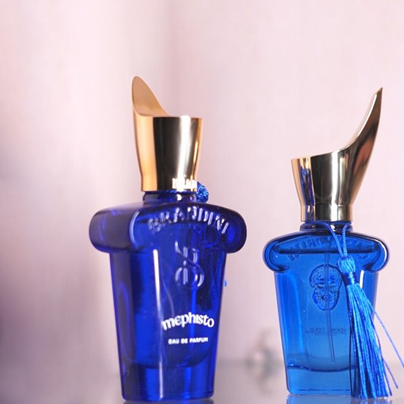 در طراحی شیشه مفیستو ادو پرفیوم مردانه برندینی از رنگ آبی بسیار جذاب و گیرایی استفاده شده که بدونشک نظر آقایان را به خوبی به خود جلب میکند. درب انتخاب شده برای این محصول طلایی بوده و با یک اکسسوری آبی رنگ تزیین گردیده تا بتواند جذابیت این محصول را افزایش دهد. بر روی شیشه شما میتوانید آرم برندینی و نام محصول را مشاهده کنید که به زیبایی و عدم یکنواختی آن کمک کرده است.